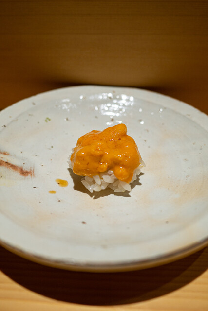 生うに、付け合わせはトウモロコシのブリオッシュパンとウニムース、