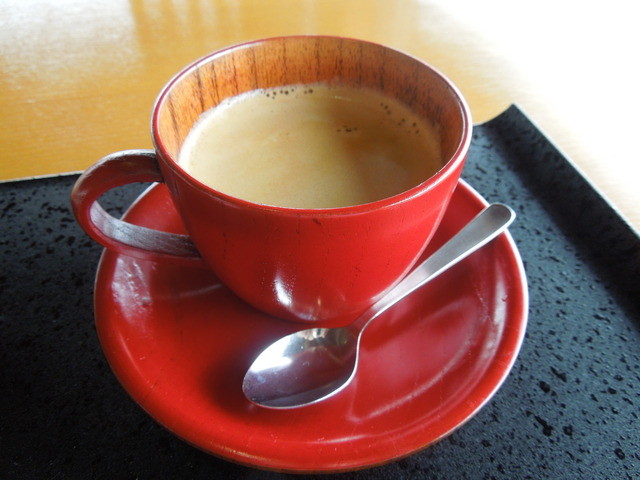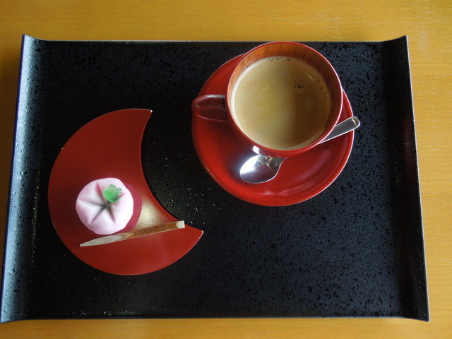 真っ黒のお盆に載せられて真っ赤なカップとお皿です。