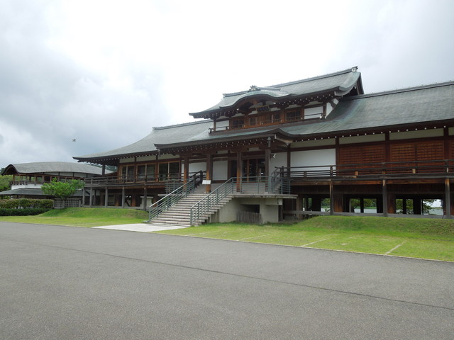 鳳凰閣の建物の前に駐車場があります。向かって左側の建物が蓮如館(記念館)です。