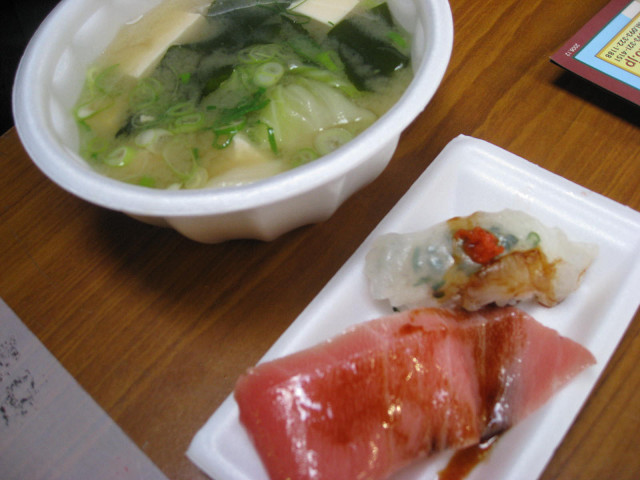 唐戸市場で食べたトロとふぐのお寿司とふぐの味噌汁