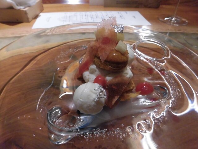 コースのデザートはお米のリゾットのスープ仕立てで、お米の甘さ・柔らかさと、ナッツとの対比が面白く美味しかったです。