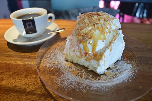 ケーキはシフォンケーキのようにとってもふんわりとしているのですが、甘さもちょうどよくって、トッピングしている生クリームとキャラメルソース、そして歯ごたえのあるナッツがとってもいい感じに調和していて、お薦めしたくなるケーキでした。