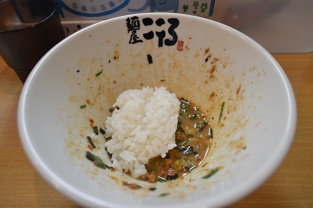麺をあらかた頂いたそのあとで、残った肉みそだれとか細かく刻まれた具とかが残るのですが、そこに無料でご飯を入れてくれるサービスも!!