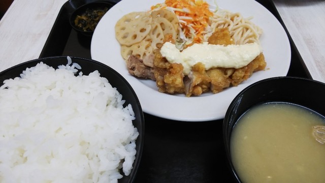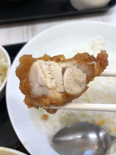 名物の唐揚げ定食をごはん少な目でお願いした。