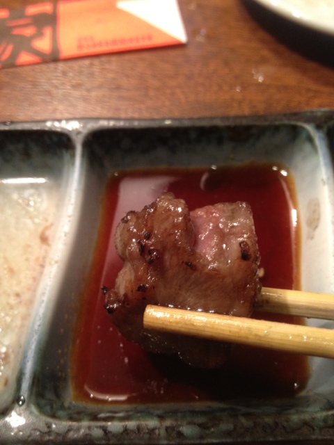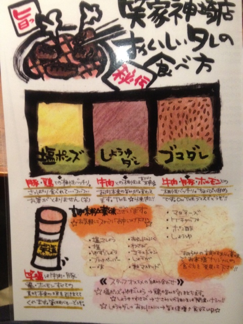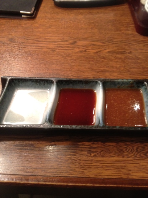 左から、ポン酢タレ、醤油タレ、ゴマタレとの事。ポン酢、ゴマは他店とあまり変わりませんが、醤油タレは甘いです。水飴沢山入れてるな。あと、笑塩と言う、特性の塩があります。僕はこの笑塩が好きです。ぜひ試してくださいね。