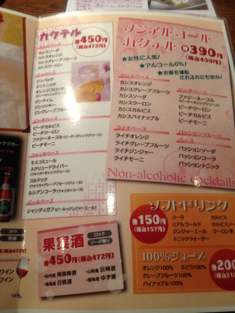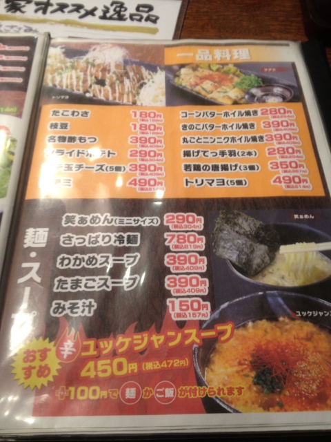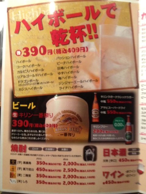 まず、飲み物を注文。連れはビール390円(税込409円)、僕は車なんで、キリンフリー290円(304円)。生ビールと100円しか違わないのが、少し悔しかった。。。