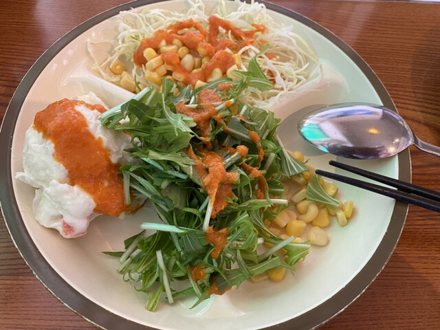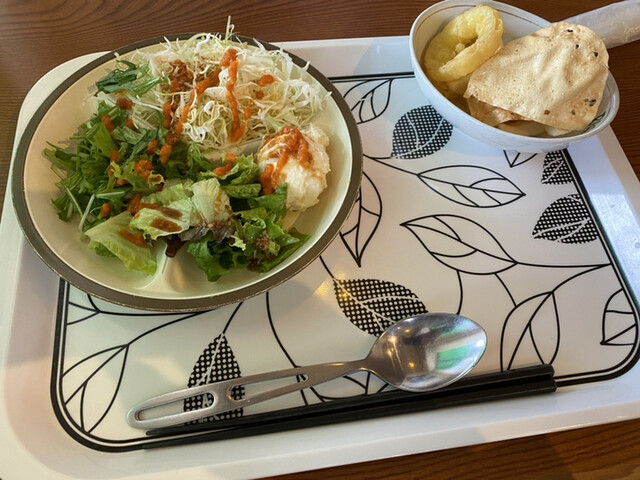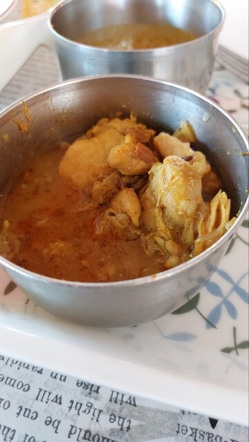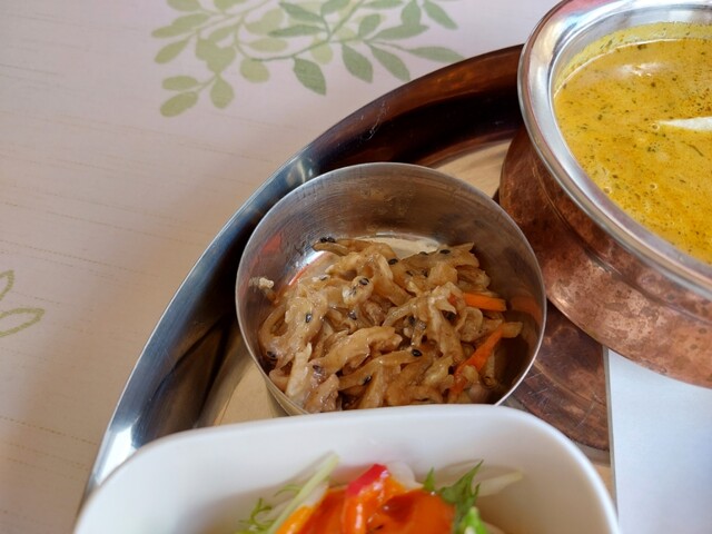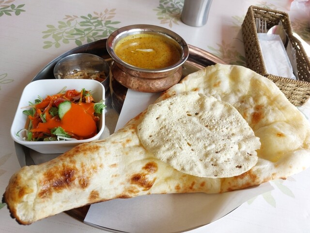 テーブルに腰かけてAミールランチ880円を注文。Aミールランチは日替わりのチキンカレーとサラダ、パパドともうひとつ何かわからない1品料理が付き、ナンかライスを選べます。ナンもライスも選んだほうのお替りは自由です。今回はナンにしました。カレーの辛さは6段階に選ぶことができ、今回は2番目の激辛をチョイス。