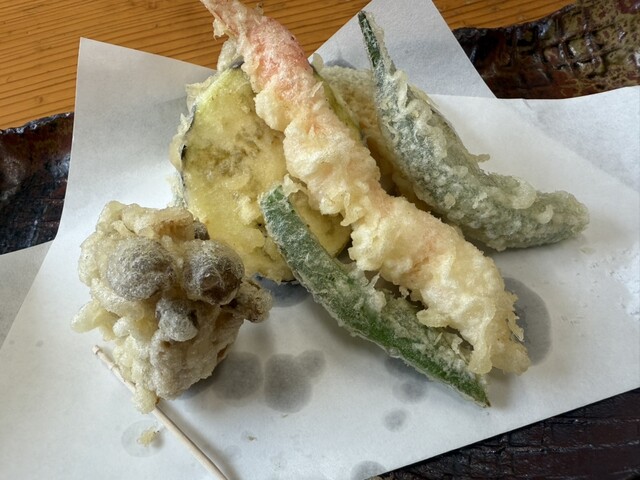 先に別皿でエビ天が運ばれてきました。お皿の隅に塩がついていま...