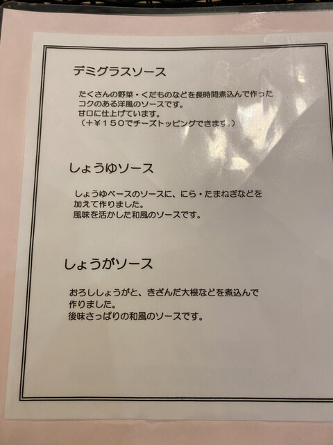 デミグラス、しょうゆ、しょうがこの3つからソースを選ぶことができ今回は