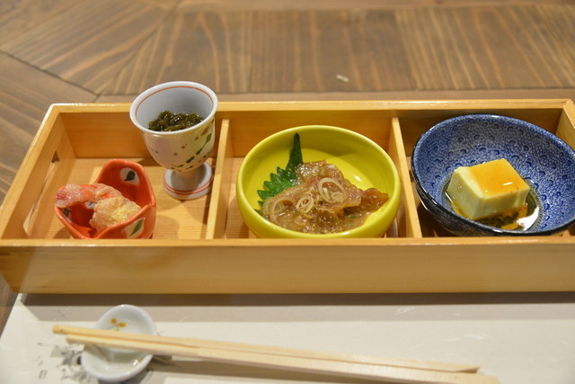 ホテルに夜ご飯がつけられず、こちらに飲みに来ました。予約なしで電話したら、ラッキーなことに空いていてカウンターに座れました。 おつまみセット(お酒一品+お料理3種)、獺祭ハー... 詳細を見る