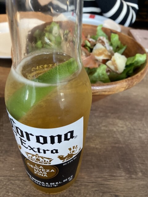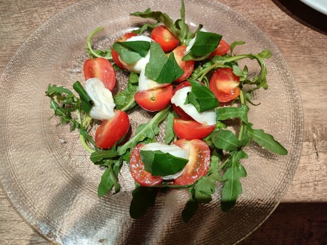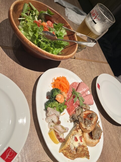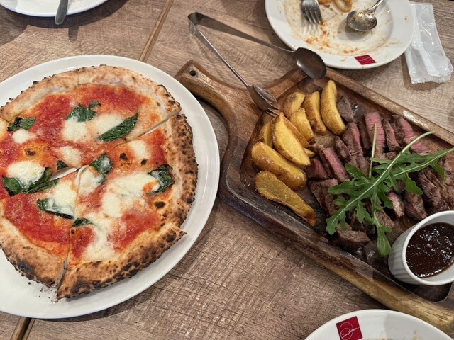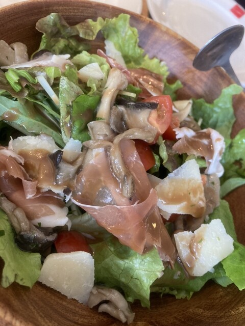 生ハムときのこのサラダが美味しかった。薄い生地のピザは安定の美味しさです。ステーキはちょっと固かったかな。