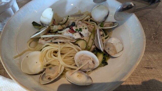 久しぶりに会う友達とランチ。ピザかパスタか迷ったけど、今回はハマグリと春野菜、白身魚のペペロンチーノを注文しました。美味しかったけど、たまたまなのか少ししょっぱかったのと、白身魚が少なめだったのが少し...