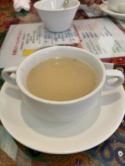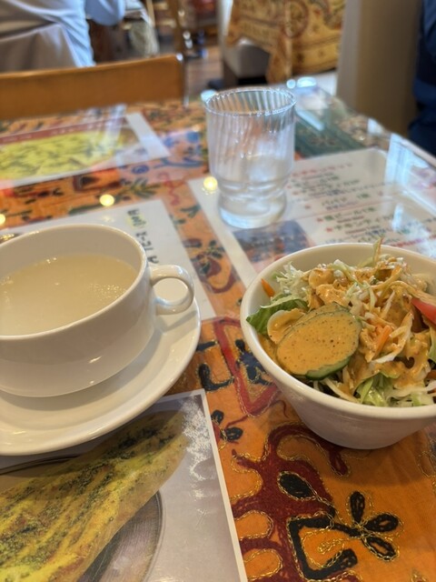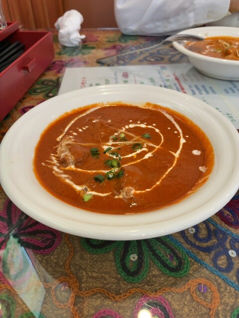先に出たスープでお腹を整えて、チキンティッカ、カレーのお盆とどんどん運ばれてきました。