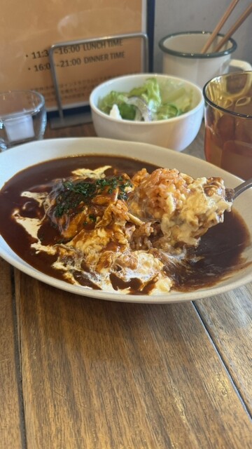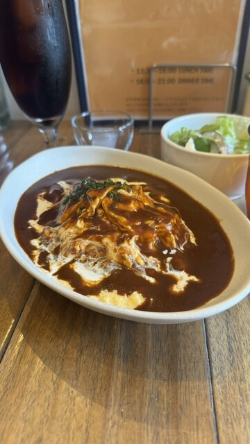 トロトロのオムライス。デミグラスソースがワインのような苦味がちょっと強く、大人向けな味だった気がする。ランチはフード注文でサラダとワンドリンクが着いていてお得な感じだった!