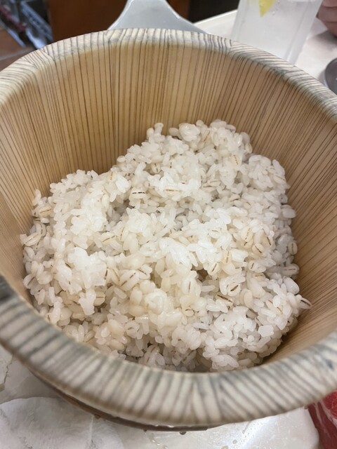 サービスの深谷の農家さん直送の麦とお米を美味しく炊いたおひつ金シャリにワンバンで圧倒的満足感♪♪