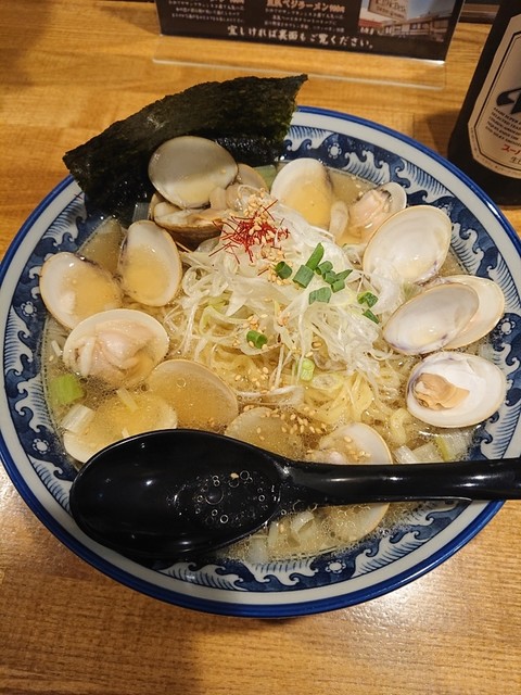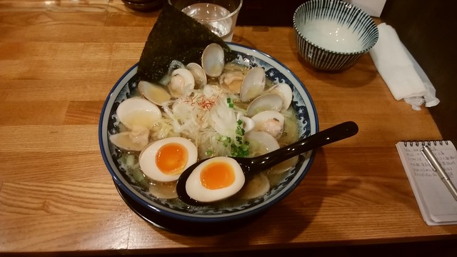 本日のランチは、こちらでいただきます。 入店し、左側の券売機ではまぐりラーメン1,000円を選択。 女性店員さんの案内で、奥のカウンター席へ。 店員さんに券を渡すと、麺は大盛にできるというので、迷わずお願いしました。 コートは、店員さんがハンガーにかけてくれます。 大き... 続きを読む»
