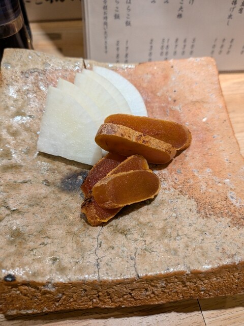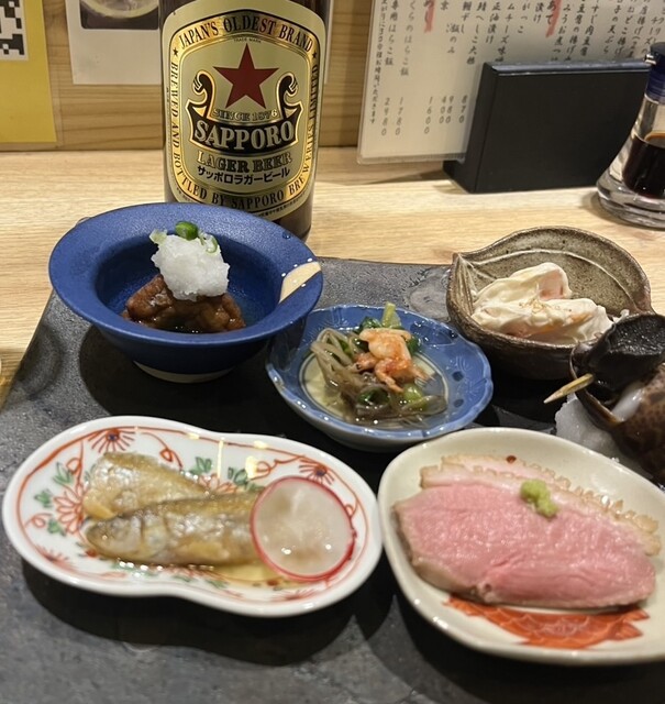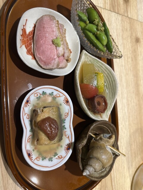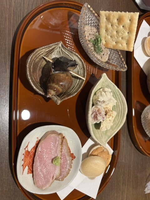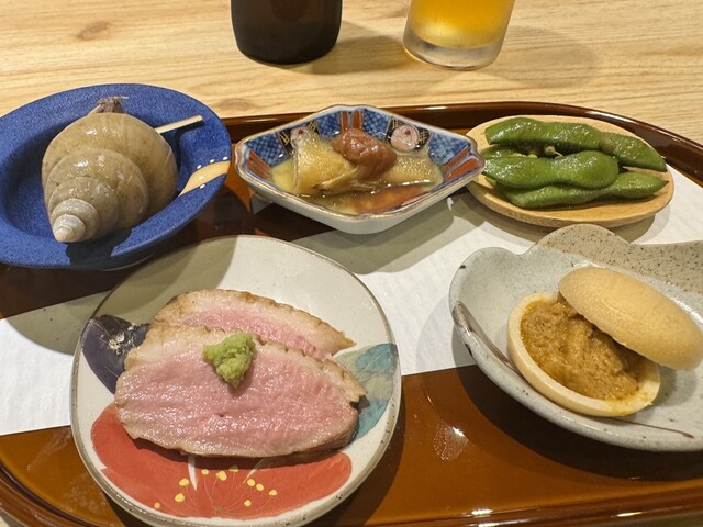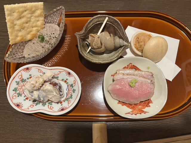 ・あん肝と奈良漬けのミニもなか・白バイ貝・合鴨たたき
