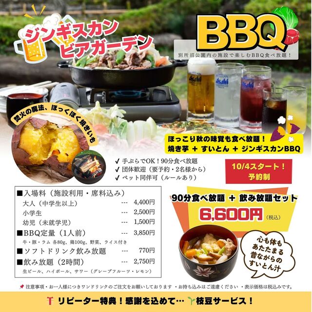 別所沼公園内にある当館ならではの自然豊かなロケーションで、ジンギスカンBBQやビアガーデンをお楽しみいただけます!