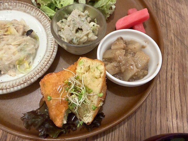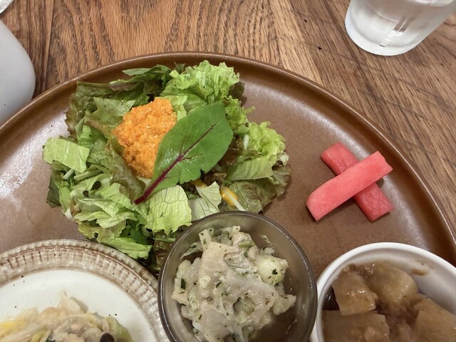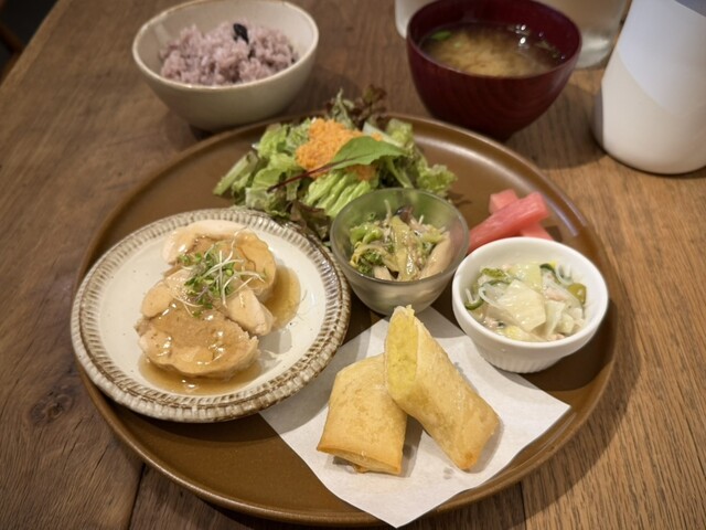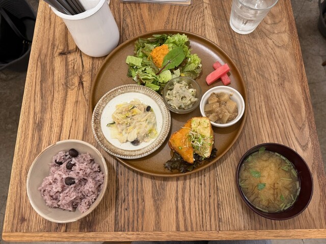「こもれび食堂+」でいただいたのは、看板メニューの〈1汁5菜のこもれびプラスプレート〉。木の温もりが感じられるナチュラルな店内で、ゆったりと身体に優しいランチを堪能できました。プレートには主菜、副菜、小鉢、汁物、ご飯がバランスよく並び、彩り豊かで見た目からも食欲をそそります。主菜は旬野菜と魚を中心にした優しい味わいで、素材そのものの旨みを丁寧に引き出している印象。副菜もひとつひとつ手作り感があり、...