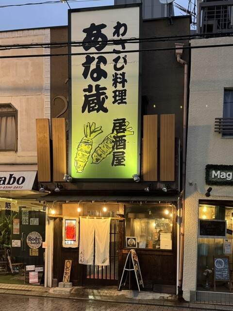 訪問日は日曜日の夕方、初見同士の2名での訪問です。当店は浦和西口の老舗が集まる通り沿いにあります。看板は「わさび料理 あな蔵」とでっかく出ていますので分かりやすいと...
