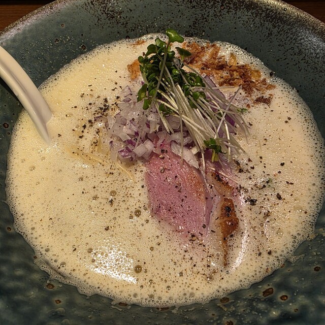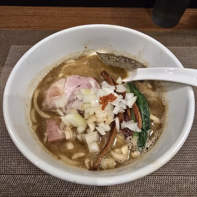 南浦和駅東口から徒歩5分弱。線路沿いにある3階建てのビルの1階に店舗を構えている。 休日12時半頃到着したが、既に3組待ちが発生。 先に食券を購入し、列の最後尾へ。しかし、5分と待たずに店内に案内された。回転率は悪くない模様。 店内は少し暗めの照明で、小綺麗。なんとなくBARの様な雰囲気を醸し... 詳細を見る