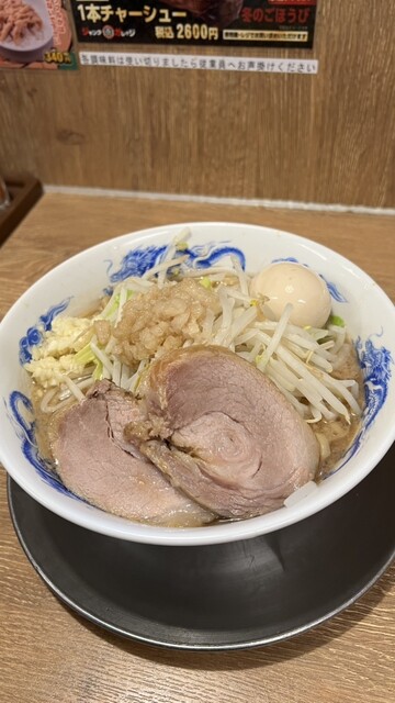 店内は木目調の清潔感ある内装で、二郎インスパイア系とは思えない落ち着いた雰囲気。背景に掲示された「1本チャーシュー(税込2,600円)」などの期間メニューが食欲をそそる。