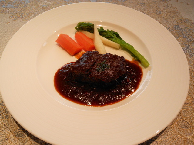 シェフ自信作【和牛ばら肉の赤ワイン煮こみ】*幻のシチュー専門店『牡丹亭』で6年間修業し、その味をお客様に食べていただきたい!!という思いで35年経った現在も作り続けているメニューです。お肉は黒毛和牛のばら肉、ソースは厳選したワインと香味野菜を使用し、10日かけて仕上げています!コース料理のメインとしてもお選びいただけます♪