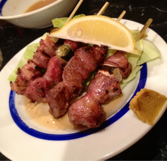 おつまみは、まぐろぶつと絶品のねぎレバーと焼き物とピリ辛のホルモン焼きです。