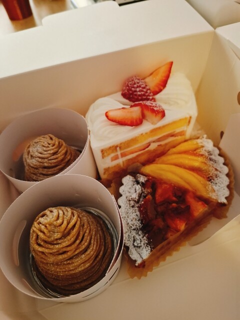ショーケースにケーキや焼き菓子が綺麗に並んでこちらを見ています。最初に目に入ったモンブランと苺のショートケーキとタルトを4種類購入しました。