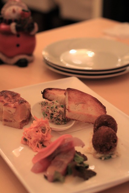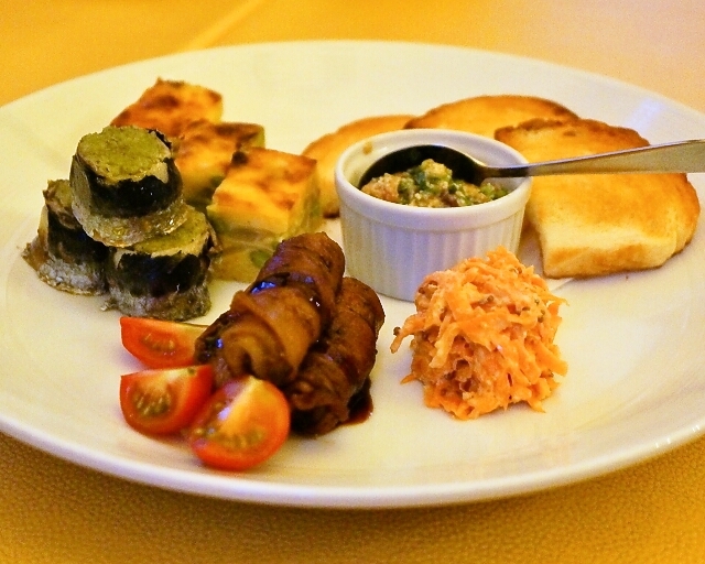 最初にウェルカムドリンク 白ブドウかローズヒップ アルコール入りも選べます ありがたいですね 前菜は右下から じゃがいもキッシュ、生ハムとニンジン、生春巻き。マグロのタルタルとバケット、蟹ク...