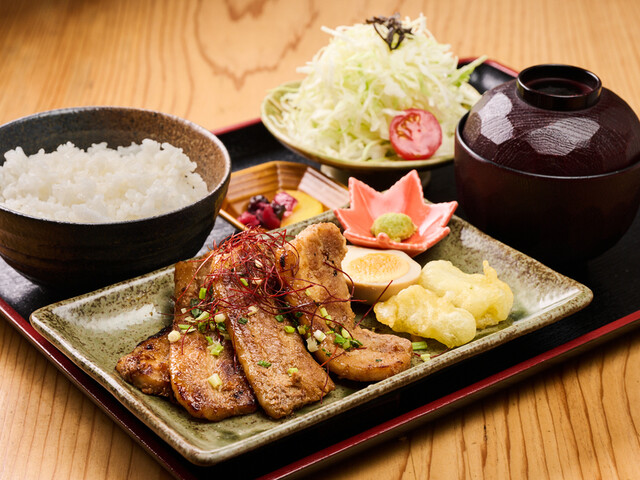 越谷ねぎの天ぷらと炭焼き豚定食 (by お店)
