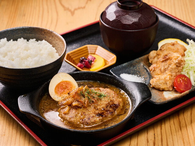 煮込みハンバーグ唐揚げ定食 (by お店)