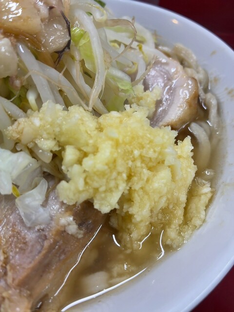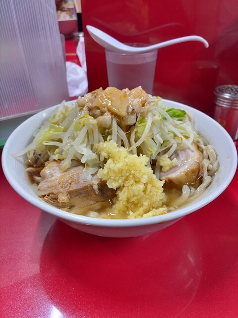 コールはニンニク、唐辛子でお願いします。一味唐辛子のトッピングは珍しいです。