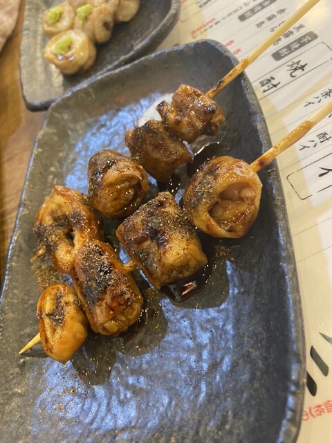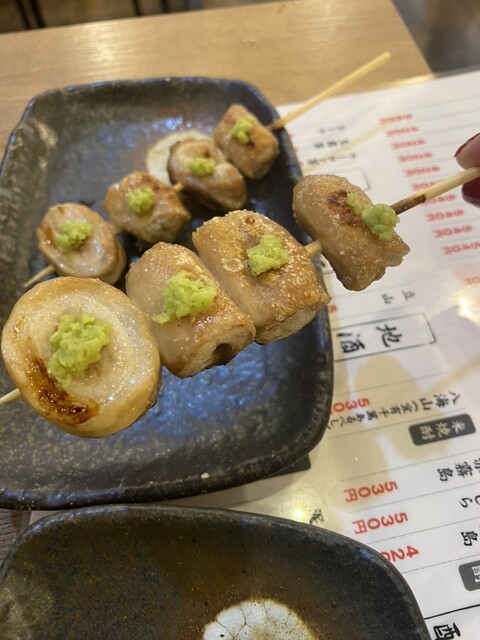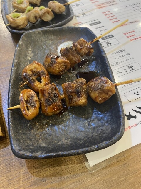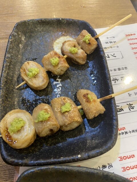 もつ煮550円 ホルモンユッケ980円 もつ焼き串 (シロコロわさび2本260円シロコロ山椒2本260円)とろろステーキ 530円 明太出しまき 550円 ガーリックライス 580円