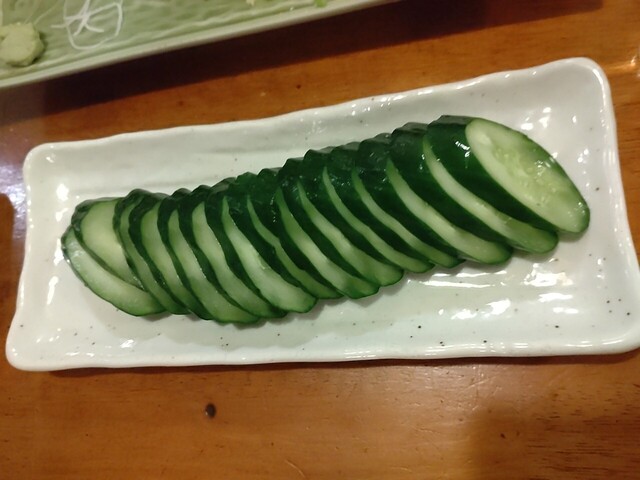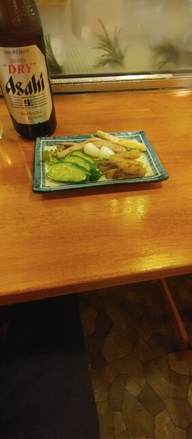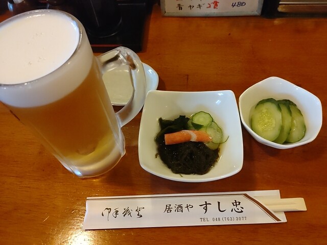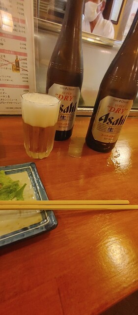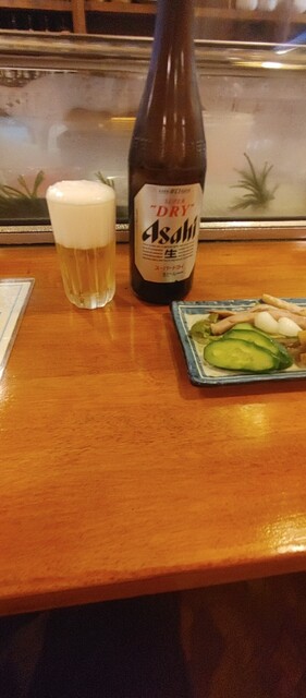 先ずは生ビールで乾杯、お通しは、もずく酢と胡瓜の浅漬け、さっぱり系が2品、個人的には嫌いでは...