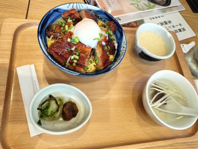 セットで付いてくるスープ、とろろ、漬物は各メニュー共通のようで、連れが頼んだ鰻玉丼にも付いてきた。