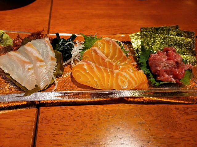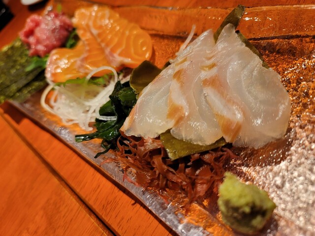・お通し(?円)/まいかけポテサラ(490円)/お刺身3点盛(1090円)/西京焼 霧島豚のロース(890円)/しらすと葱のピッツァ(890円)/本日のクラフトビール(590円)/... 続きを読む»