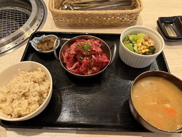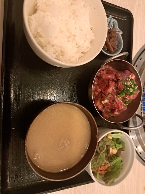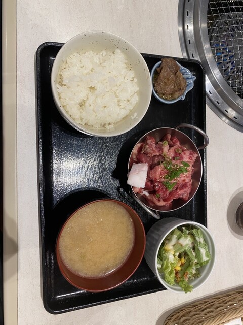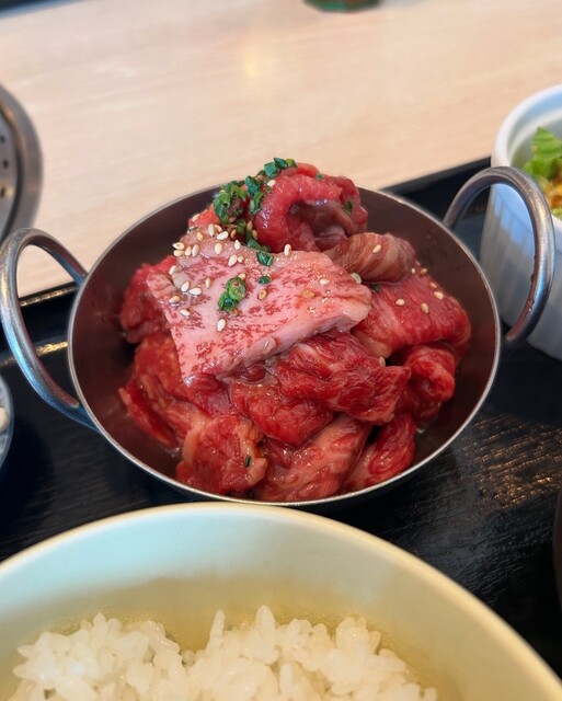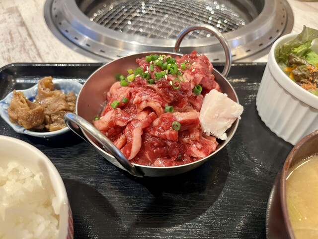 ランチで切り落とし定食を注文。お肉はカルビっぽい部位からハラミっぽい赤み肉も入ってて、3種類程度のお肉が入ってそうだった。