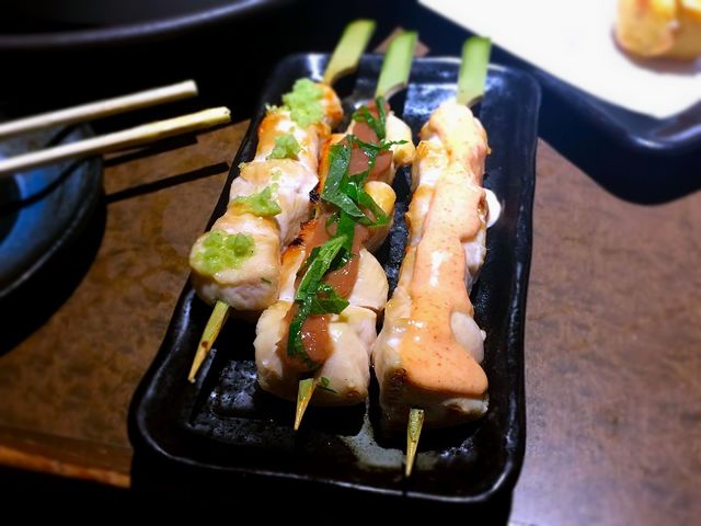 ふっくらと焼きあがったささみ串に、3種のソース(明太マヨ、わさび、梅しそ)がのります。