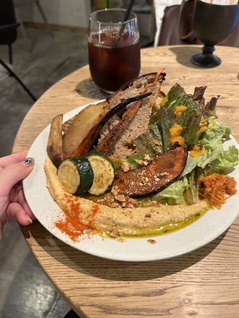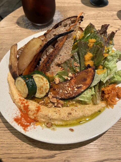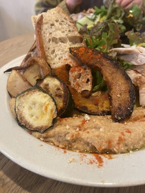 フムスは前回もいただいてはまってしまいました。焼き野菜のほろ苦さとフムスのクリーミーで甘みを感じる味わいがマッチしていてクセになります。乗っている3種類のパンもどれも美味しい。きっとこのプレート...