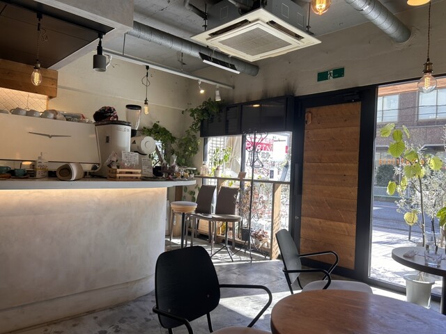 駅近のお洒落なカフェでジャズっぽい曲が流れてました。店内はゆったりしたスペースのある空間、オープンテラスで外にも椅子があるので言えば外も可能かもです。