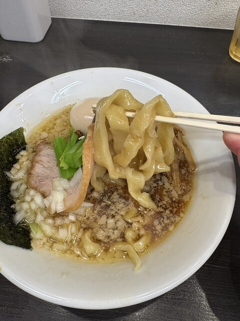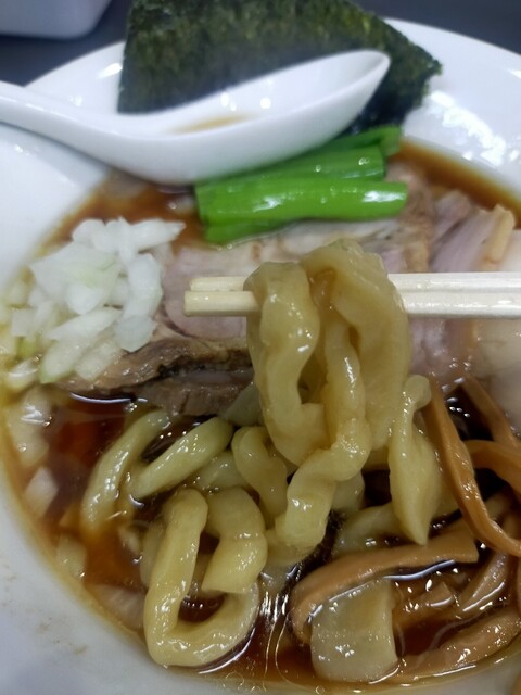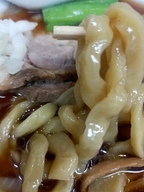 独特の麺は、きしめんのように太いけれど、ちぢれ麺で最高にスープと絡み...