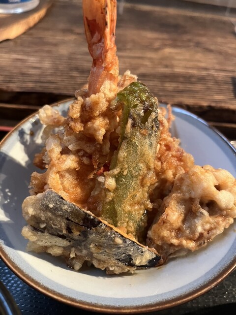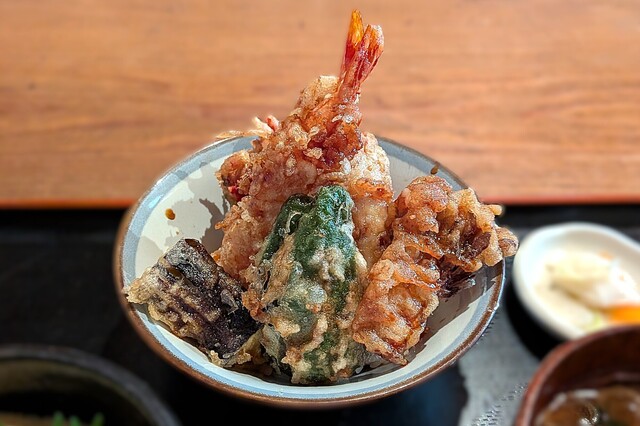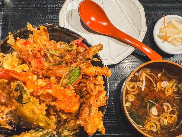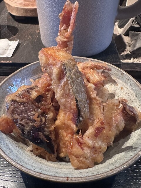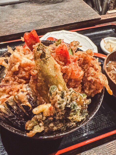 出てきた天丼は天ぷらの品数が多く、海老2本、かき揚げ、ピ...