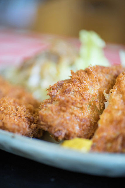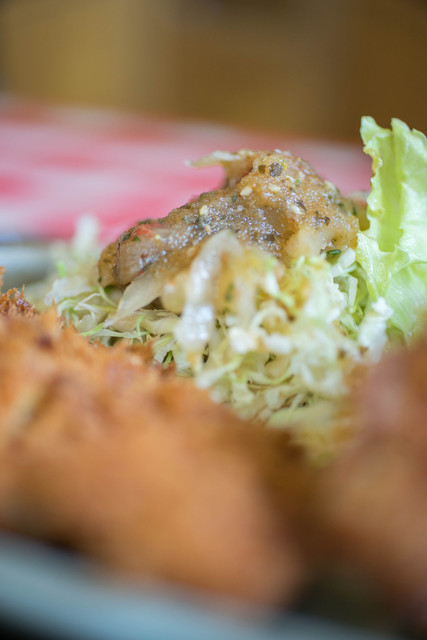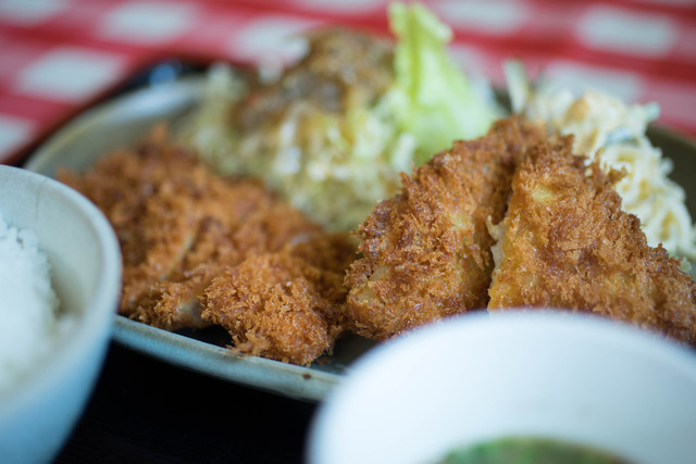 "炸豬排(とんかつ)"と"炸竹莢魚(あぢふらい)"の盛合(もりあ)はせ。