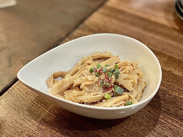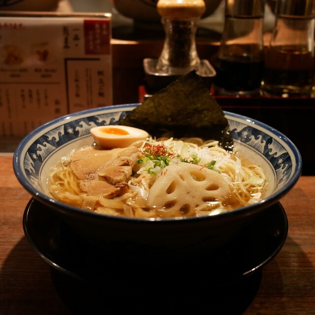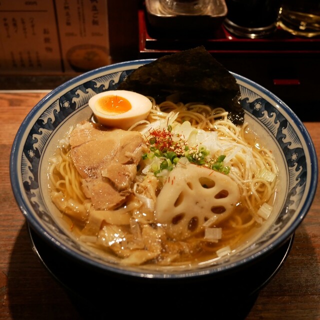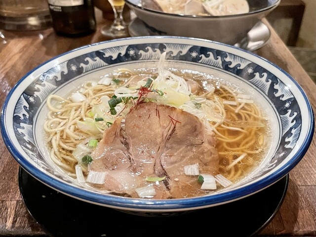 麺は中細ストレート。コシと言うよりは歯応えを楽しむ感じ。スープはさっぱりとした透明度の高いもので、洋風にも和風になりそうなもので...