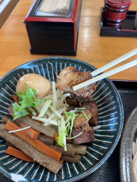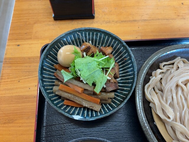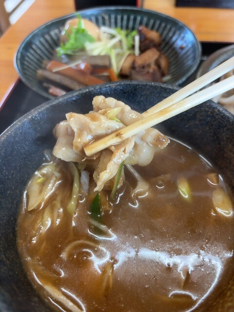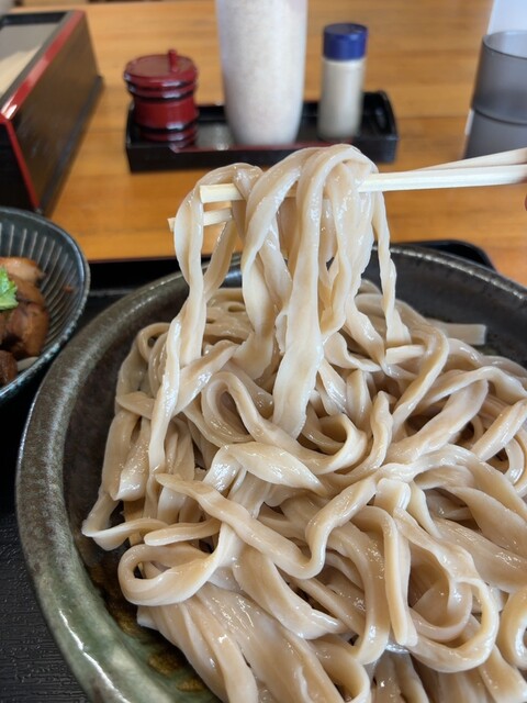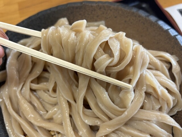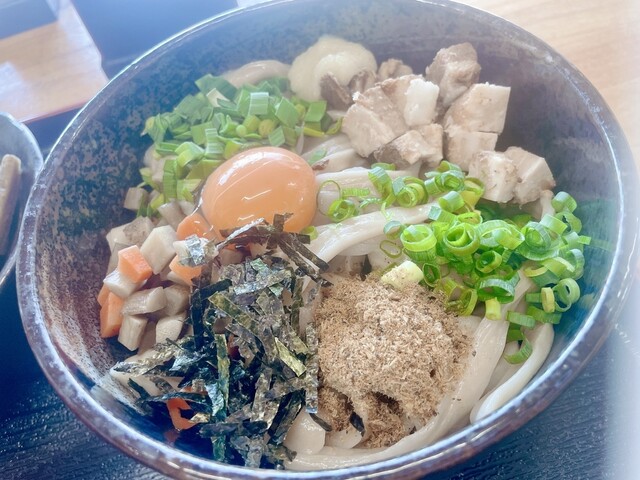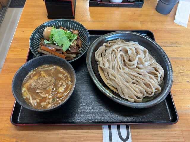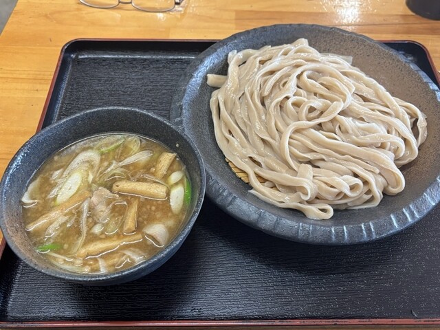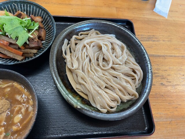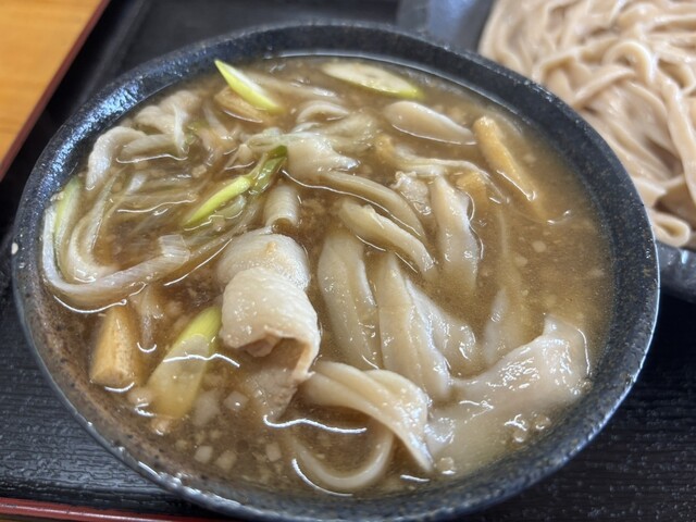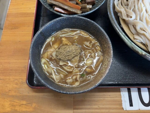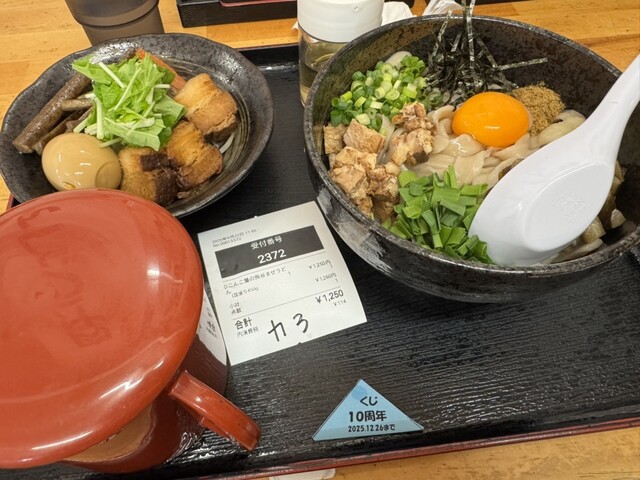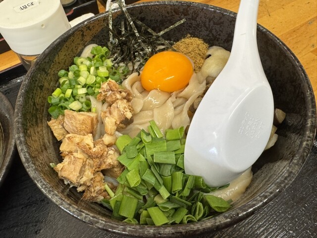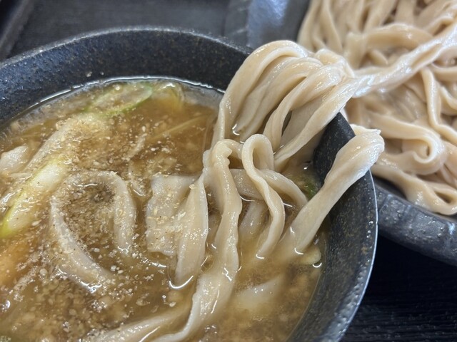 手打ちうどんのちぢれ麺に王道の肉汁、濃厚な魚介豚骨を合わせてみました。 |