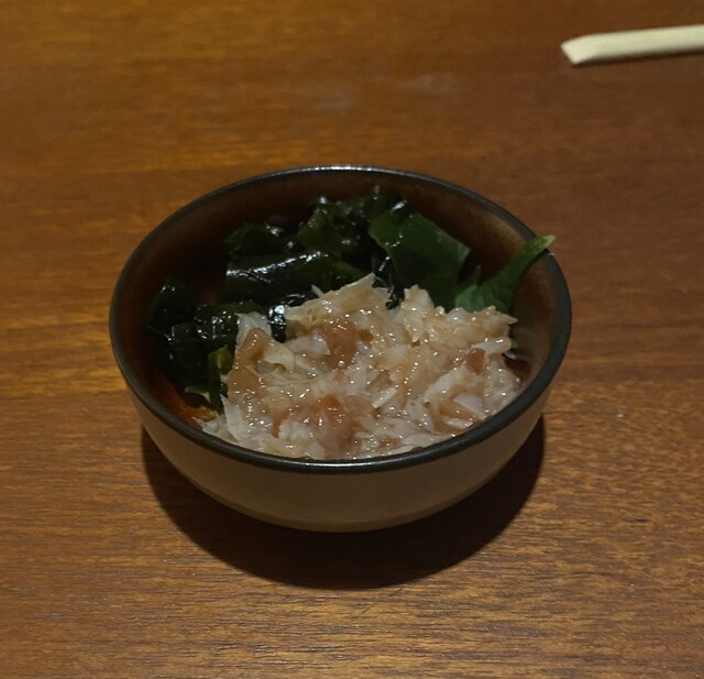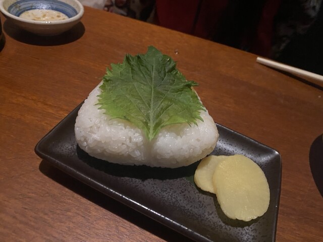 連れの友人はここでお酒からご飯にシフト。味噌おにぎりと珍味茶漬け。