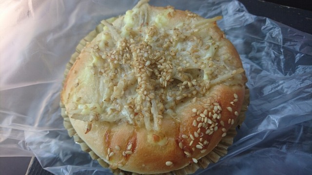 パン売り場、隣のカフェ及びテラスで買ったパンを食べられます |