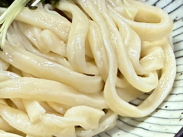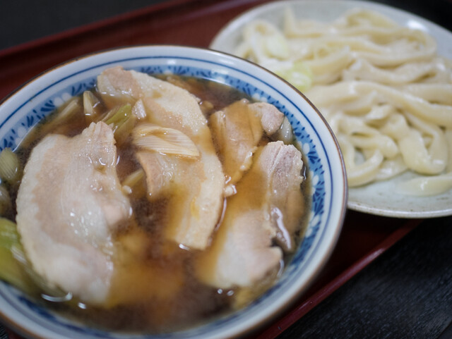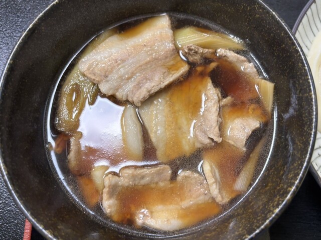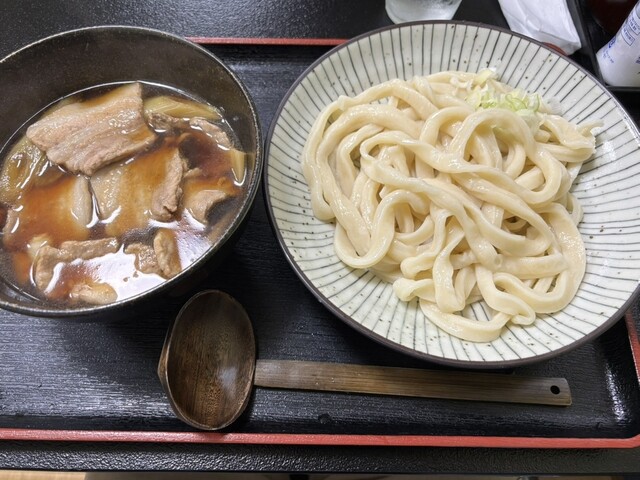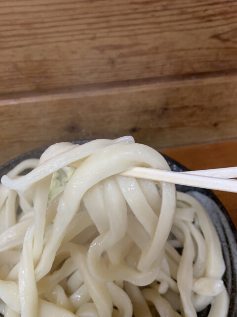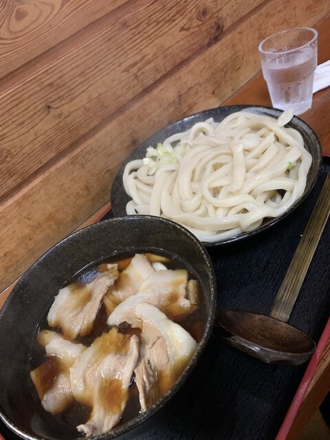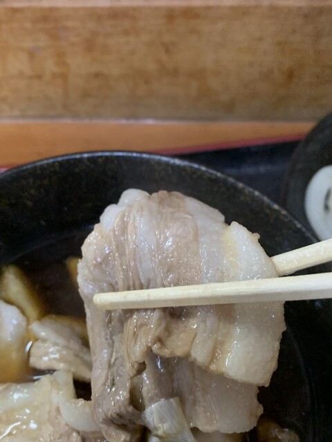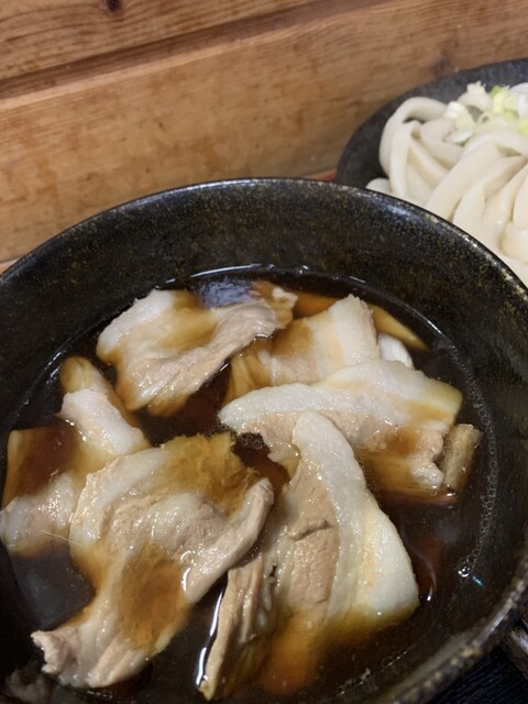 さっそく太いうどんをおつゆにしっかり浸していただくと、太いうどんの小麦の風味がおつゆによく合います。豚バラの脂身...