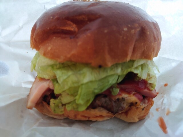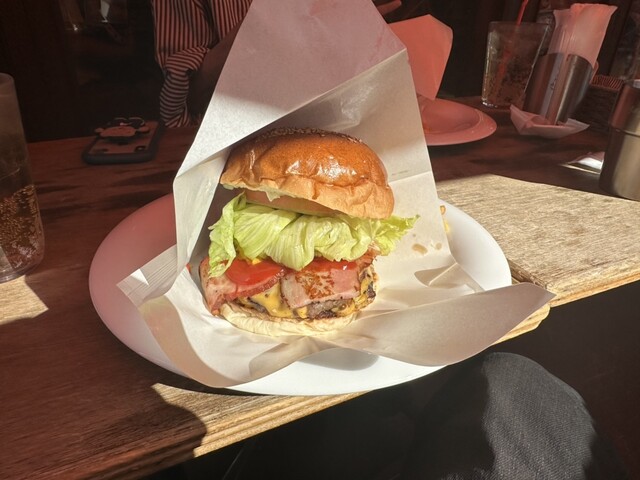 タワー系のバーガーではないが、こん盛りレタスにはみ出しているベーコン、チーズとケチャップがたっぷりと食欲をそ...